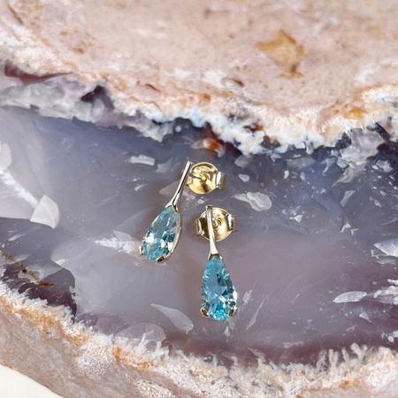 Wyjątkowe złote kolczyki z olśniewającym niebieskim topazem to doskonały wybór dla kobiet ceniących luksus i subtelną elegancję. Centralny kamień – naturalny topaz o pięknej, intensywnie błękitnej barwie – został osadzony na trzech delikatnych ramionach wykonanych z żółtego złota, co podkreśla jego czystość i blask..